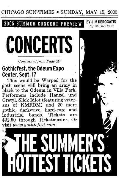Press Gothicfest 2005 was featured in Spin Magazine with a full 5 page article on the event “Day of the Not-Quite Dead” is the caption displayed on the cover Gothicfest was featured in the Sun Times as one of the summers hottest tickets Share this: Share on Facebook (Opens in new window) Facebook Share on X (Opens in new window) X Share on LinkedIn (Opens in new window) LinkedIn Share on Pinterest (Opens in new window) Pinterest Share on WhatsApp (Opens in new window) WhatsApp Share on Telegram (Opens in new window) Telegram Share on Tumblr (Opens in new window) Tumblr Share on Pocket (Opens in new window) Pocket Share on Reddit (Opens in new window) Reddit Email a link to a friend (Opens in new window) Email Print (Opens in new window) Print Like Loading...